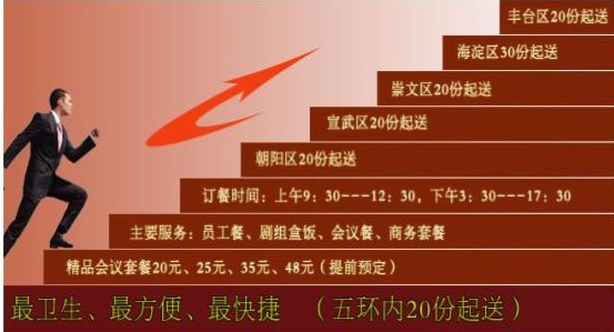 快餐配送服務(wù)區(qū)域:朝陽(yáng)、海淀、東城、西城、崇文、宣武、豐臺(tái)、石景山、昌平、通州、大興、懷柔、覆蓋各個(gè)區(qū)域,門(mén)頭溝區(qū)和密云除外,服務(wù)于廣大客戶(hù),配送時(shí)間五環(huán)內(nèi)均在半小時(shí)之內(nèi),五環(huán)外均在1個(gè)小時(shí)之內(nèi),保證各個(gè)區(qū)域的客戶(hù)都能享受到京朝軒快餐的優(yōu)質(zhì)服務(wù)。30份以上起送。