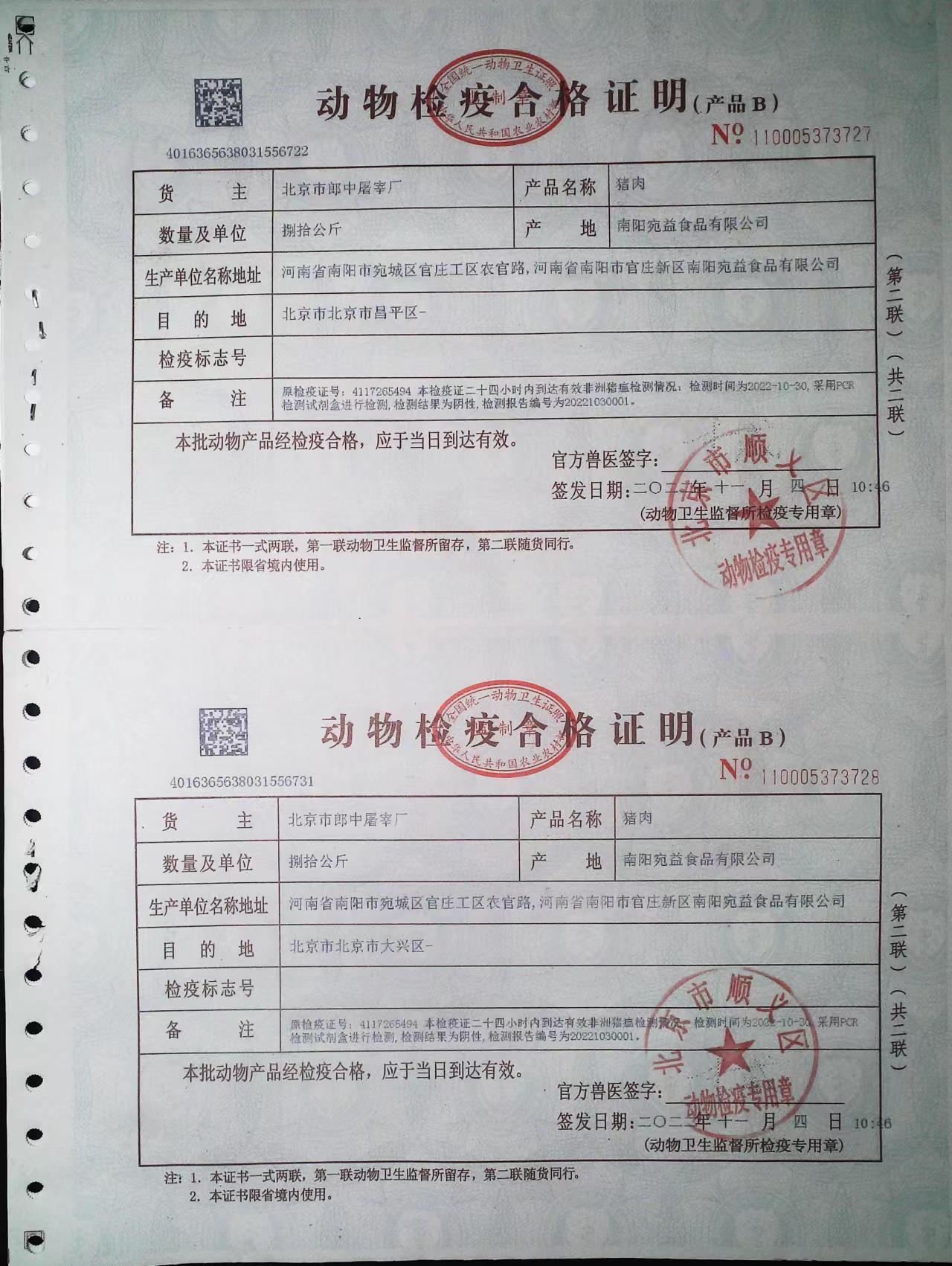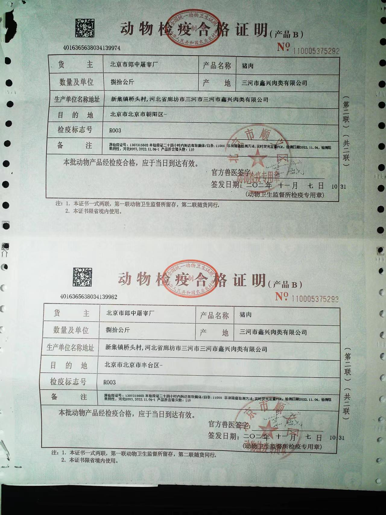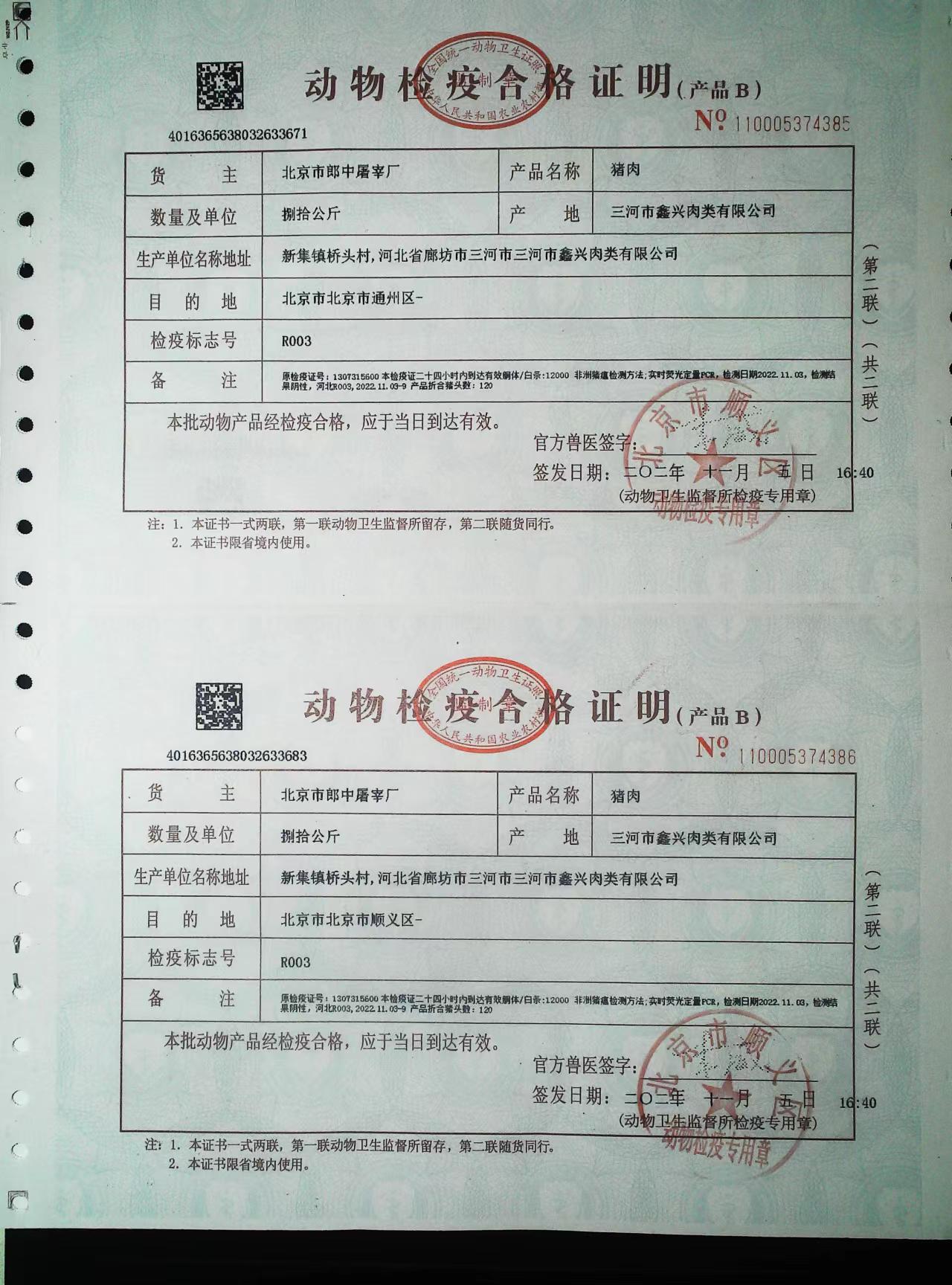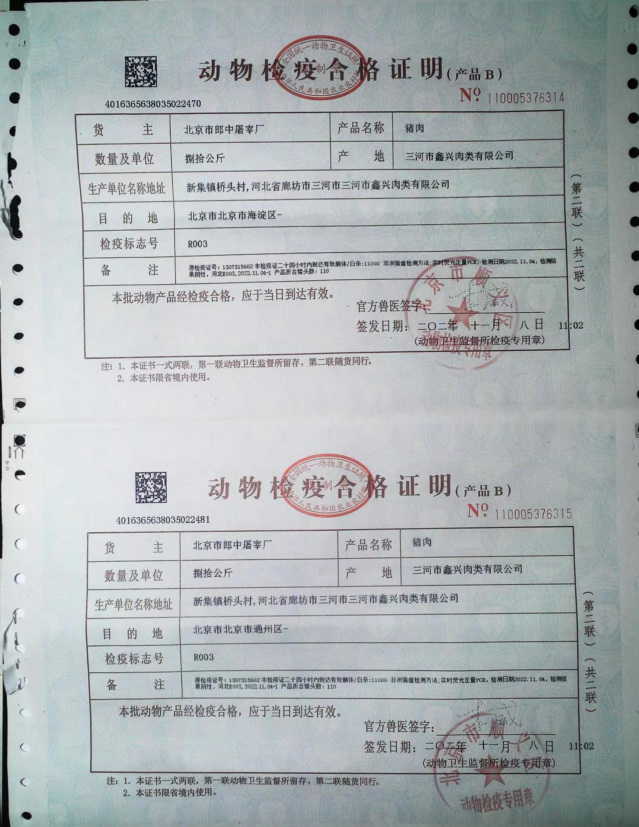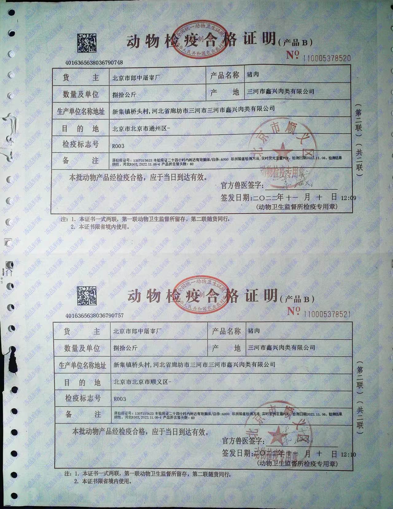 ? ? ? 新冠疫情當下京朝軒食堂承包管理制度嚴格執(zhí)行,食堂工作人員核酸檢測保證每日一檢,不僅對本公司員工負責,而且也對客戶的員工用餐負責,采購方面也加強管理,嚴格監(jiān)控索證制度,禁止不合格的肉類、米面、糧油、調料等進入食堂,下面是京朝軒食堂采購豬肉類動物檢疫合格證明: