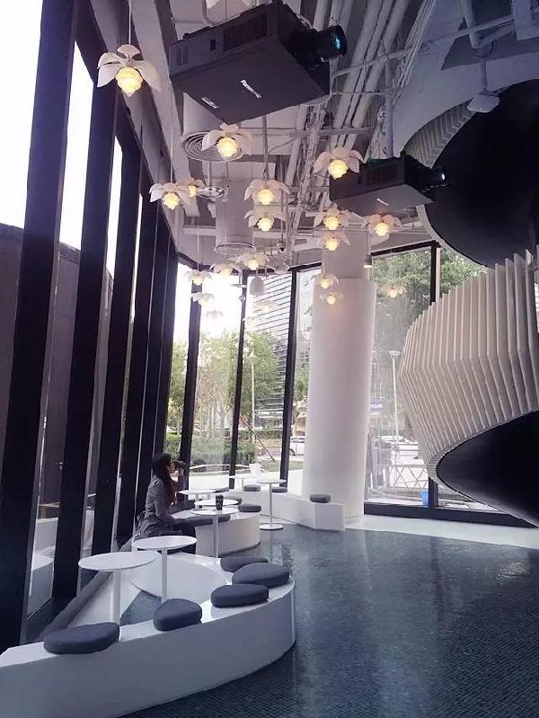 一層還設計了咖啡簡餐就餐區(qū),設計簡潔,但是天花的設計卻很有特色,如花一樣的燈飾把簡單的餐廳妝點得更加好看。
