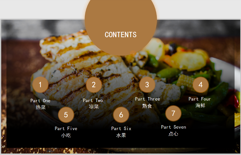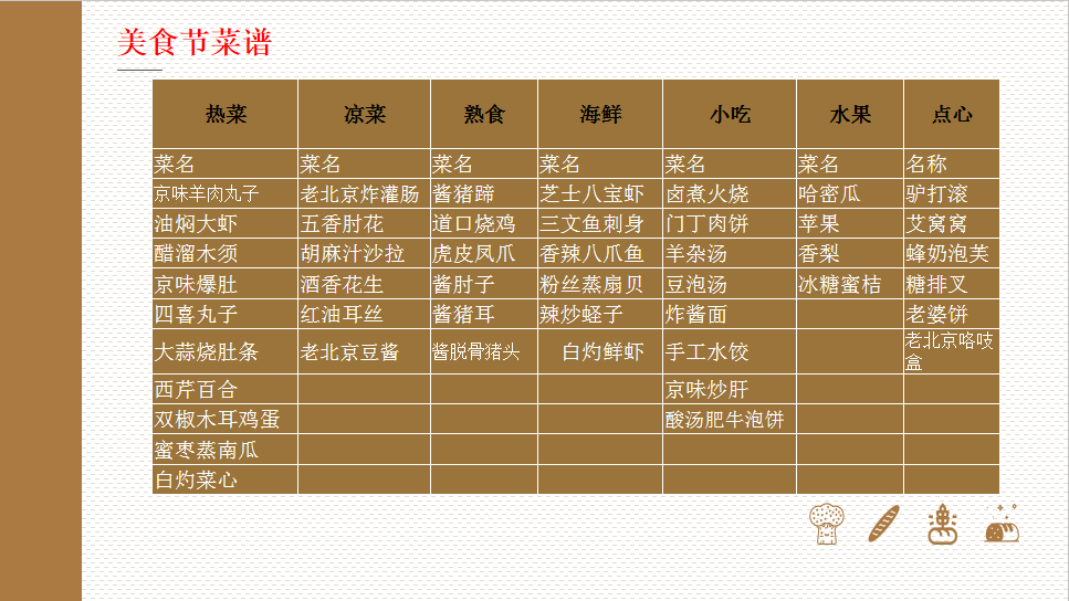 熱菜、涼菜、熟食、海鮮、小吃、水果、點心